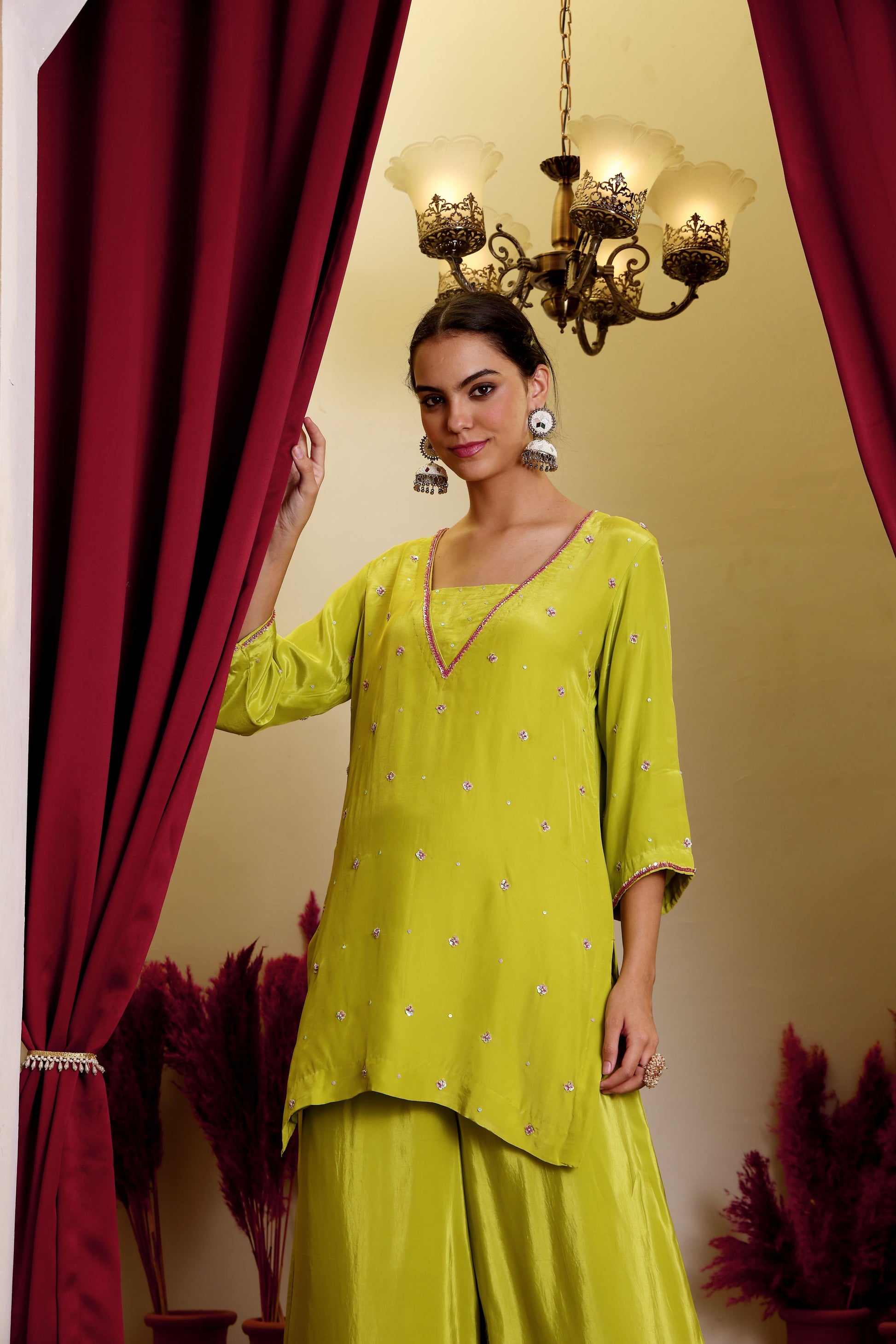 Add a touch of elegance to your wardrobe with this green crepe kurti and palazzo set. The kurti is adorned with intricate embroidery that enhances its traditional charm, while the subtle detailing adds a refined appeal. Paired with a flowy pure dupatta, this ensemble beautifully balances grace and comfort — perfect for festive gatherings, celebrations, or special occasions.